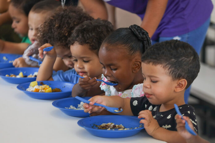 O horário do almoço reorganiza a dinâmica da unidade. As refeições incluem combinações balanceadas, com arroz, feijão, proteínas e legumes. Os bebês permanecem nas salas, enquanto as crianças maiores utilizam o refeitório, preparado para diferentes idades.
