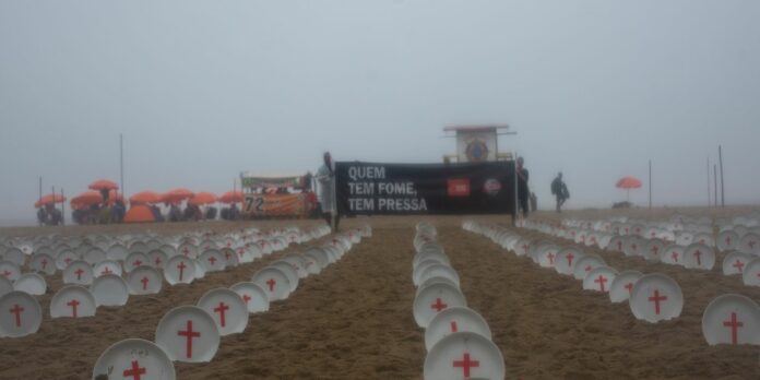 Quem passou pela Praia de Copacabana na manhã deste sábado (16) se deparou com mais de 700 pratos vazios fincados na areia. O ato que pedia o fim da fome no mundo foi uma das duas manifestações realizadas na orla da praia mais famosa do Rio de Janeiro, às vésperas da reunião de cúpula do G20, grupo formado pelas maiores economias do planeta mais a União Europeia e a União Africana.