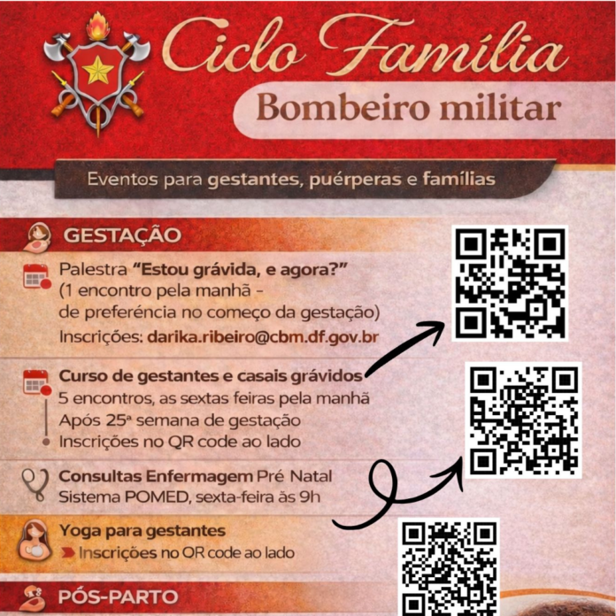 O Corpo de Bombeiros Militar do Distrito Federal (CBMDF), por meio da Diretoria de Saúde, promove o Ciclo Família – Bombeiro Militar, iniciativa voltada à promoção da saúde materno-infantil e ao apoio às famílias desde o período gestacional até os primeiros meses de vida da criança.