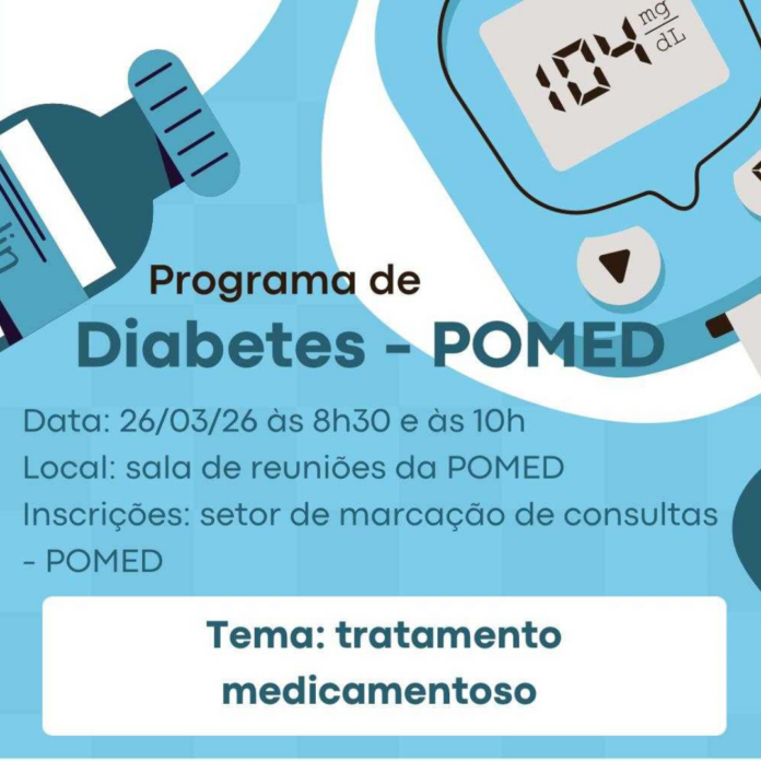 A próxima palestra do programa de diabetes acontecerá no dia 26 de março, quinta-feira, em dois horários: às 8h30 e às 10h, na sala de reuniões da Policlínica Médica (POMED) com o tema “Tratamento medicamentoso do diabetes”, ministrada pela médica endocrinologista Maj Marcelle Cristina. As inscrições devem ser realizadas na subseção de marcação de consultas (SUMAC) na POMED. Palestra destinada a pessoas com diagnóstico de diabetes.