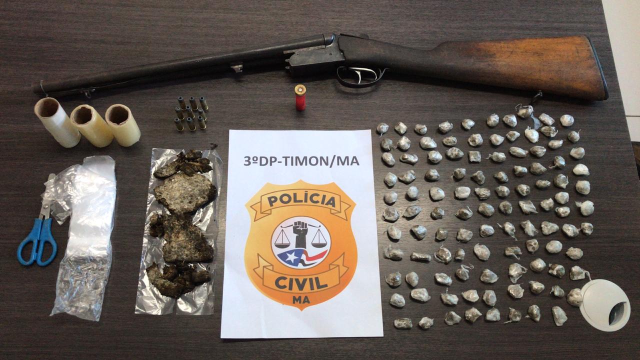 Durante o cumprimento do mandado foram localizados, na residência do representado, uma espingarda calibre .32, de cano duplo, com munição de mesmo calibre; nove munições de revólver calibre .32, intactas; cento e seis “trouxinhas” de maconha, além de uma quantidade da substância ainda não embalada para a venda.