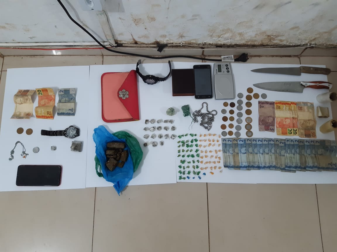Foram localizadas e apreendidas, na residência do casal, substâncias que tudo indica, tratar-se das drogas Crack (85 porções individualizadas) e Maconha (aproximadamente 70g), material de embalagem, balança de precisão e dinheiro.