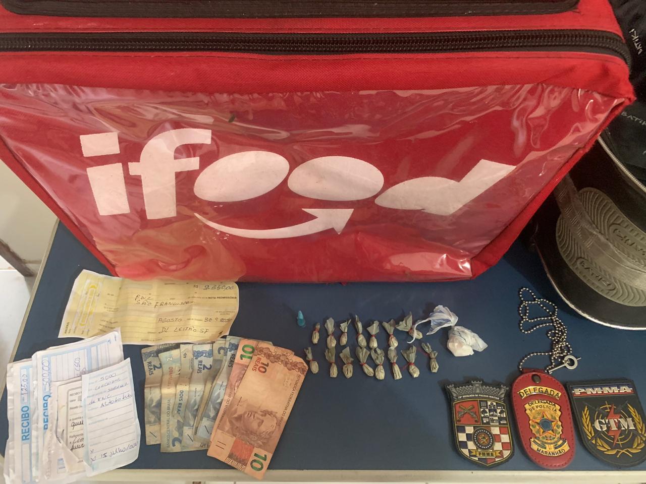 Na abordagem, foram encontradas com suspeito dezesseis porções de substância semelhante a cocaína, um pino de substância semelhante a cocaína, dois tubos de linha, um rolo insufilme, uma mala com farelos de substância esverdeada semelhante a maconha, a quantia de R$46,00 em espécie, bem como vários recibos e anotações da contabilidade do tráfico.