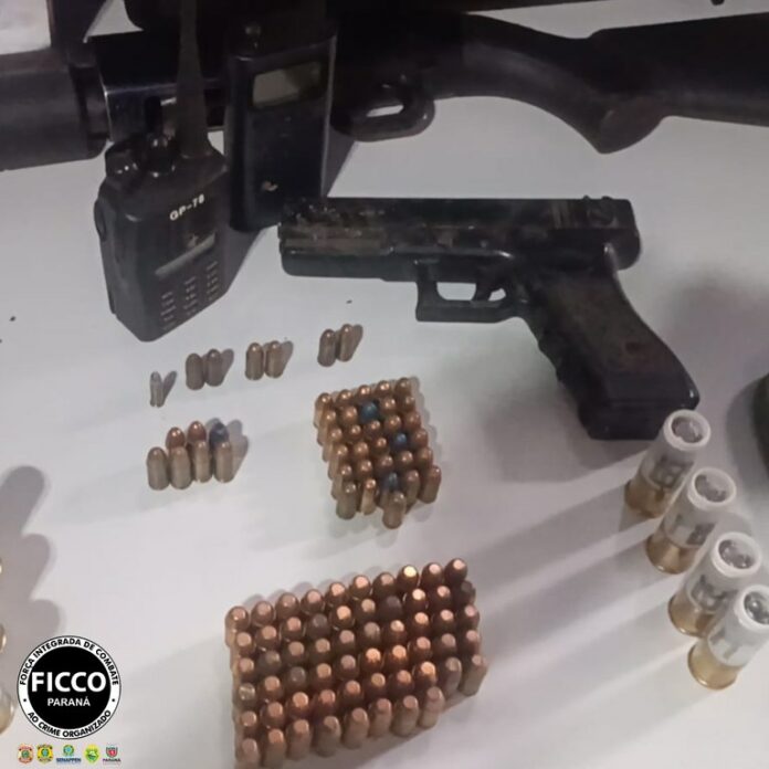 Foz do Iguaçu/PR.  A Força Integrada de Combate ao Crime Organizado do Paraná (FICCO/PR) apreendeu 86 kg de drogas, armas de fogo, 103 munições de diferentes calibres, além de equipamentos como coletes, balança de precisão e rádios comunicadores, em uma comunidade localizada nas proximidades do rio Paraná, em Foz do Iguaçu, na última quarta-feira (23/4).