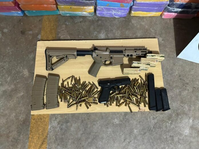 Durante fiscalização, realizada por equipes do Tático Ostensivo Rodoviário (TOR) da Polícia Militar, foram localizados aproximadamente 270 quilos de cocaína, além de um fuzil Colt calibre 5.56, uma pistola Glock calibre 9 mm, carregadores e 133 munições.