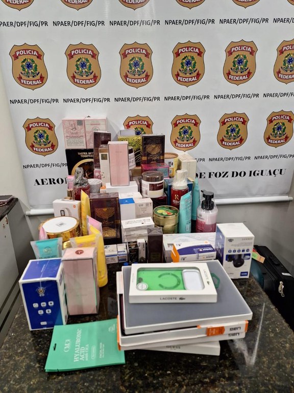 Foz do Iguaçu/PR. A Polícia Federal apreendeu, na quarta-feira (18/2), centenas de medicamentos e produtos importados descaminhados durante fiscalização realizada no Aeroporto Internacional de Foz do Iguaçu/PR.