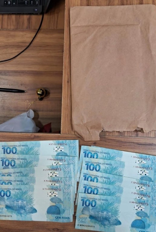 A equipe policial interceptou e acompanhou a entrega de uma encomenda postal suspeita. Ao proceder à abordagem e abertura do pacote, os policiais localizaram mil reais em notas supostamente contrafeitas.