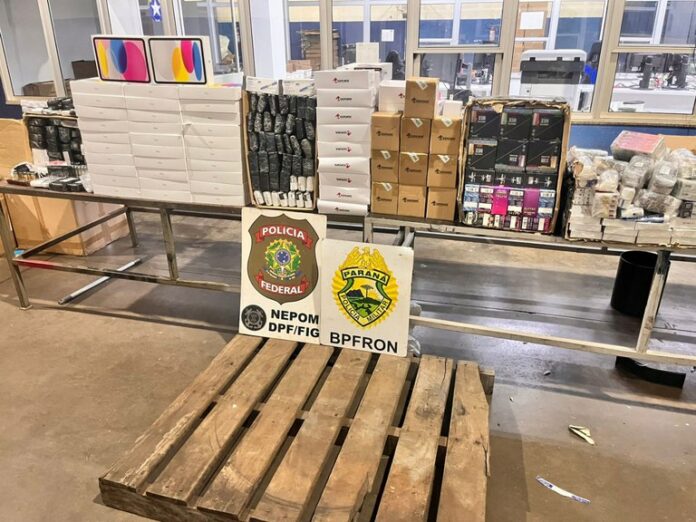 Foz do Iguaçu/PR. Ação conjunta entre a PF e a PM resultou na apreensão, na noite de sexta-feira (1/8) de centenas de eletrônicos nas margens do Rio Paraná, em Foz do Iguaçu, após volumes serem descarregados no lado brasileiro por embarcação proveniente do Paraguai.