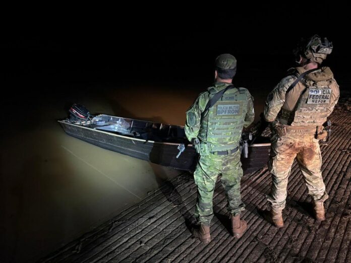 Foz do Iguaçu/PR. A Polícia Federal, com apoio da Polícia Militar do Paraná, apreendeu, nessa terça-feira (10/2), uma embarcação oriunda do Paraguai que realizava o descarregamento de fardos contendo entorpecentes na margem brasileira, em Missal/PR. Na ação, dois homens de cidadania paraguaia foram presos em flagrante.