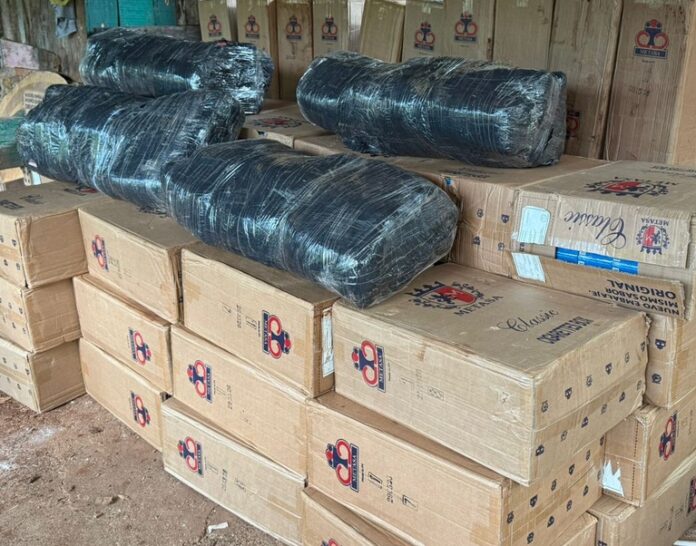 Durante as buscas, foi localizado um local onde estavam armazenadas 62 caixas de cigarros de origem paraguaia e quatro volumes contendo maconha do tipo capulho, totalizando, aproximadamente, 75 kg da droga.