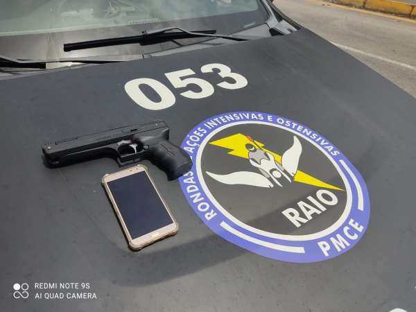 Por volta das 11h30 desta quinta-feira, equipe do Comando de Policiamento de Rondas e Ações Intensivas e Ostensivas (CPRaio), estava em patrulhamento na avenida Osório de Paiva, quando foram acionados via Coordenadoria Integrada de Operações de Segurança (Ciops) para averiguar na avenida João Pessoa um carro roubado Fiat Palio de cor branca realizando assaltos na região, juntamente com uma motocicleta Honda CG Start de cor vermelha, roubada. Os raianos abordaram o carro na av. João Pessoa, altura do nº 6943, e capturaram Ana Caroline Oliveira de Moraes (24), Pablo Gustavo Simões Ferreira (21), Marcos Elias Feitosa de Castro (19) e um menor de 16 anos. No carro, os policiais militares apreenderam ainda um simulacro de pistola e um aparelho celular. Momentos depois, foi encontrado e abordado também a motocicleta roubada, sendo pilotada por um menor de 16 anos.