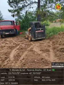 No local, a equipe constatou a presença de uma máquina do tipo bob cat e de um caminhão caçamba realizando serviços de limpeza do lote. Questionado, o operador informou que o imóvel pertenceria ao padrasto de sua irmã. Foram apresentados documentos tanto pela solicitante quanto pelos responsáveis pela execução do serviço, os quais demandaram análise quanto à sua regularidade.