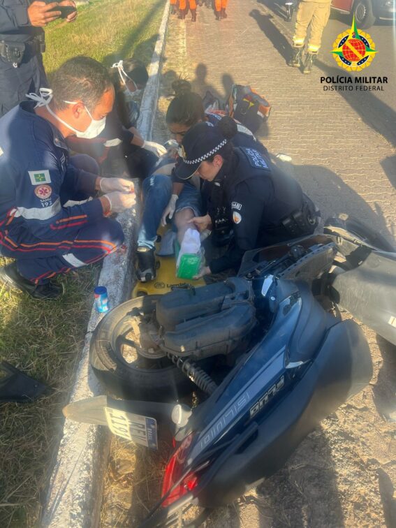 Ao chegar ao local, os policiais realizaram a segurança da cena e auxiliaram no atendimento à vítima em conjunto com o Serviço de Atendimento Móvel de Urgência (SAMU) e o Corpo de Bombeiros Militar do Distrito Federal (CBMDF). A vítima, consciente e orientada, apresentava lesão no membro inferior esquerdo e foi encaminhada ao Hospital de Base do DF (HBDF) sob protocolo de trauma.