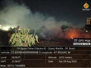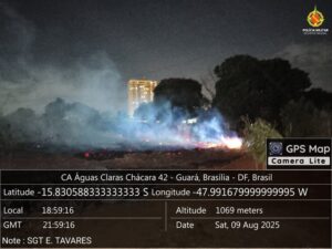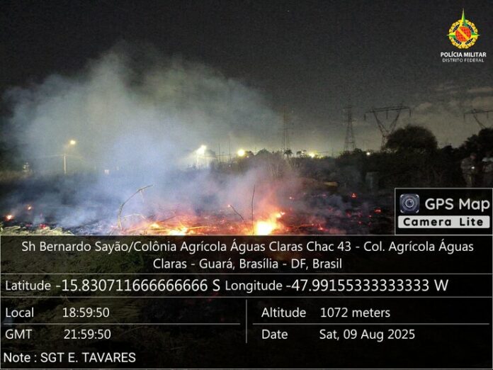 No dia 09/08/2025, por volta das 18h30, a Polícia Militar Ambiental, através do Grupamento de Operações no Cerrado (GOC), realizava patrulhamento na região do Guará quando identificou uma grande concentração de fogo e fumaça originada da queima de vegetação sob a rede de alta tensão.