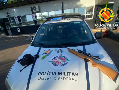 A ocorrência teve início quando uma policial militar, em deslocamento para assumir serviço, percebeu gritos de socorro e visualizou o autor portando objeto semelhante a arma longa. Diante do flagrante e do risco iminente, procedeu à abordagem, logrando êxito em contê-lo. Durante a busca pessoal, foram encontrados em posse do autor uma faca e um estilete, ambos de potencial lesivo. O apoio foi reforçado por militares do 9º Batalhão da PMDF e por um policial da PMGO, que auxiliaram na contenção e condução do indivíduo.