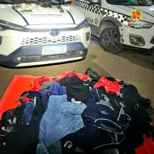 Os autores foram surpreendidos pelas equipes quando se deslocavam pela 1ª Avenida Norte transportando objetos provenientes de furto ocorrido em estabelecimento comercial. Durante a abordagem, foram recuperados aproximadamente R$ 8.000,00 em bens, entre roupas e eletrônicos/eletrodomésticos, além da apreensão da ferramenta utilizada para o arrombamento.
