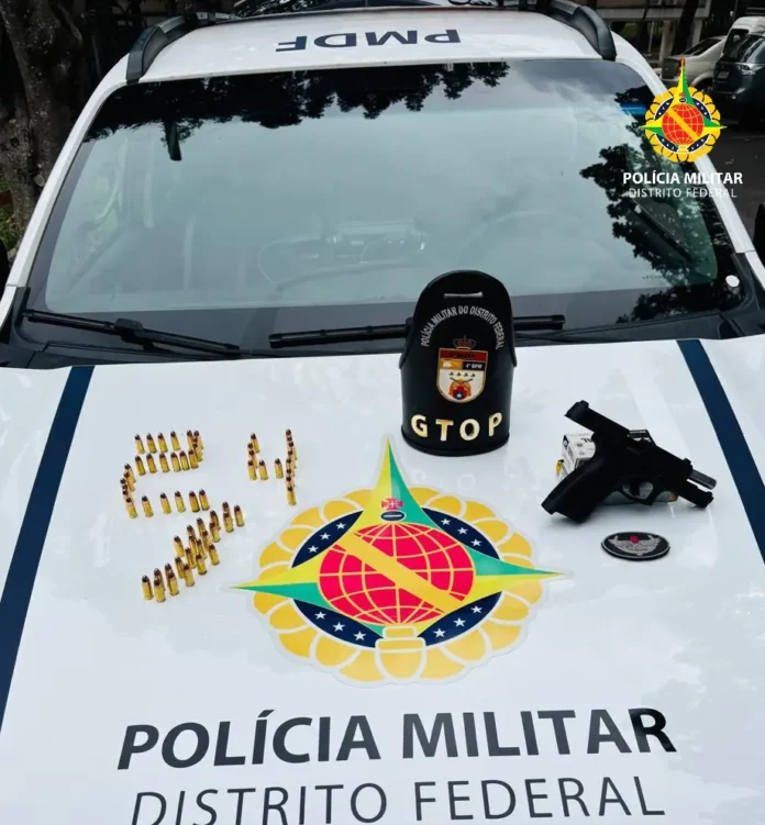 Diante dos fatos, autor e vítima foram conduzidos à Delegacia Especial de Atendimento à Mulher (DEAM) para as medidas legais cabíveis. Durante o atendimento, o autor admitiu possuir uma arma de fogo e informou ser Colecionador, Atirador e Caçador (CAC), apresentando documentação parcial. A equipe retornou à residência, com autorização do próprio autor, onde localizou uma pistola marca Taurus, modelo G3, calibre 9mm, acompanhada de 60 munições intactas, encontradas sobre o guarda-roupa do quarto.