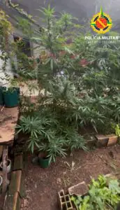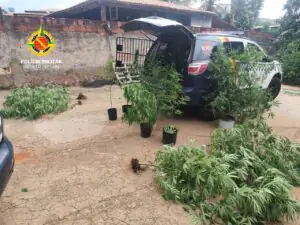 Com a autorização, os militares entraram no imóvel e localizaram potes contendo substância análoga à maconha, cigarros já preparados, balança de precisão e materiais utilizados para embalagem. Na área externa também foram encontrados e retirados 19 pés de cannabis, caracterizando cultivo para fins ilícitos.