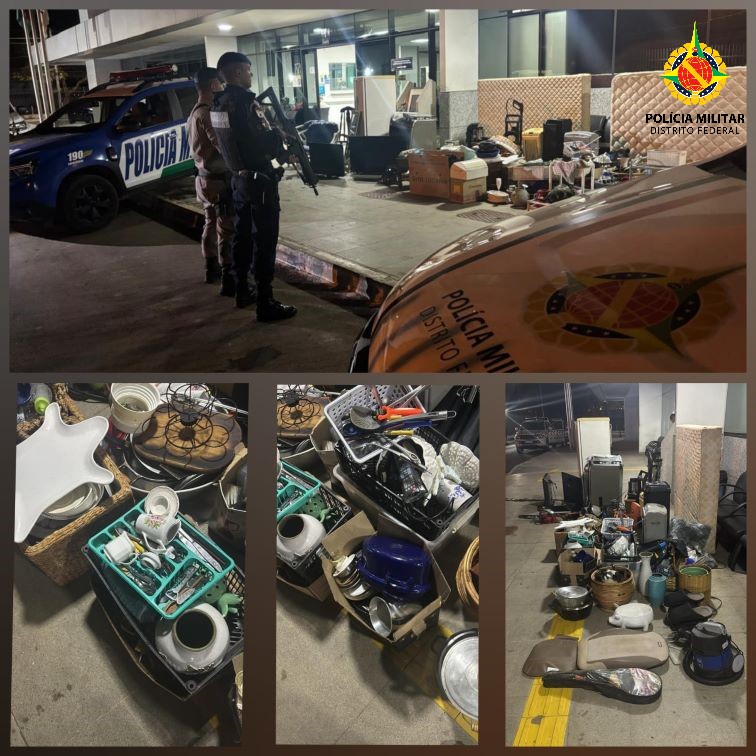 A equipe da PMDF entrou na residência com autorização do indivíduo e realizou buscas, encontrando 3 aparelhos de televisão, um fogão, um colchão, poltronas, geladeira, diversos utensílios de cozinha (pratos, copos, louças), motosserra, lavadora de carros a pressão, aparelhos de massagem e outros equipamentos e utensílios domésticos pertencentes à chácara em Planaltina de Goiás. Além disso, foram encontrados 2 simulacros de arma de fogo e 2 estojos de munição calibre 9mm.