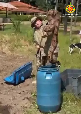 Concluída a captura, a jiboia foi devidamente transportada e devolvida ao seu habitat natural, sendo solta em área adequada.