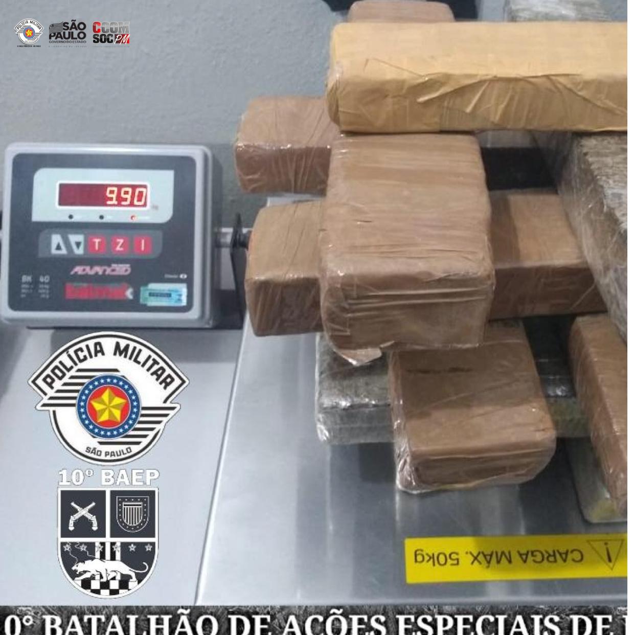 Segunda-feira (7), policiais militares do 10º BAEP – Batalhão de Ações Especiais de Polícia estavam em patrulhamento pela Rua Carminé Maimone, Parque Residencial João Ometto, em Limeira, onde avistaram e abordaram um indivíduo em atitude suspeita. Com a abordagem a equipe apreendeu porções de cocaína e R$ 87,00. Em seguida, a equipe foi na residência do abordado, na Rua Ângelo Perillo, Jardim Olga Veroni, onde foram apreendidos 11 tabletes de maconha, totalizando 9 kg da droga.
