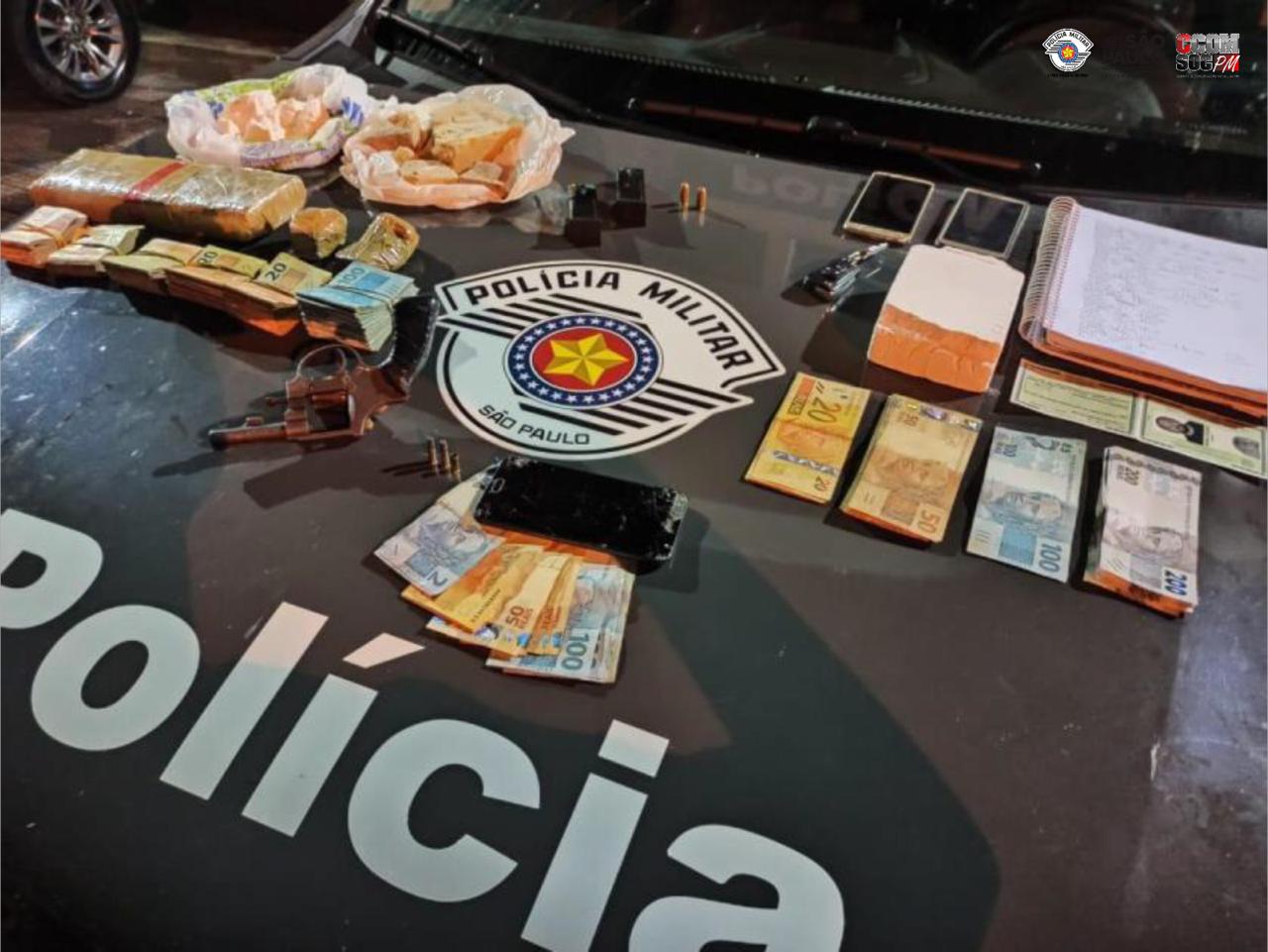 Segunda-feira (16), Policiais Militares do 13º BAEP – Batalhão de Ações Especiais de Polícia prenderam um criminoso pela prática dos crimes de tráfico de drogas e porte ilegal de arma de fogo. O indivíduo foi abordado próximo ao trevo de acesso da Avenida Moussa Tobias à rodovia Marechal Rondon, em Bauru, sendo que ao desembarcar do veículo tentou empreender fuga no mato à margem da rodovia, contudo foi alcançado e detido. Durante a fuga, o criminoso arremessou um revólver calibre 22, que foi localizado. Diante de informações de que tal indivíduo fazia a armazenagem e distribuição de drogas na região, foi realizada diligência até sua residência e lá foram encontrados R$ 22.304,00 e 2,602 kg de drogas no forro da casa e também em um compartimento/cofre no interior do veículo do abordado, onde também foram localizados dois carregadores de pistola e duas munições intactas calibre 380. Ainda na residência, foram localizados uma cédula de identidade com indícios de falsificação, um caderno contendo anotações de contabilidade referentes ao tráfico de drogas e 3 aparelhos celulares. O preso, que já possuía antecedentes criminais pela prática de tráfico de drogas e associação para o tráfico, foi conduzido ao Plantão Policial, onde permaneceu à disposição da Justiça.
