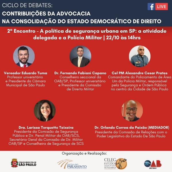A Diretoria da Escola do Parlamento da Câmara Municipal de São Paulo convida a todos para o evento Ciclo de Debates, referente ao 2° encontro com o tema “A política de segurança urbana em SP: a atividade delegada e a Polícia Militar”, que se realizará em 22OUT20 às 14h00 pelo Facebook Live, nos termos consignados no expediente de origem.
