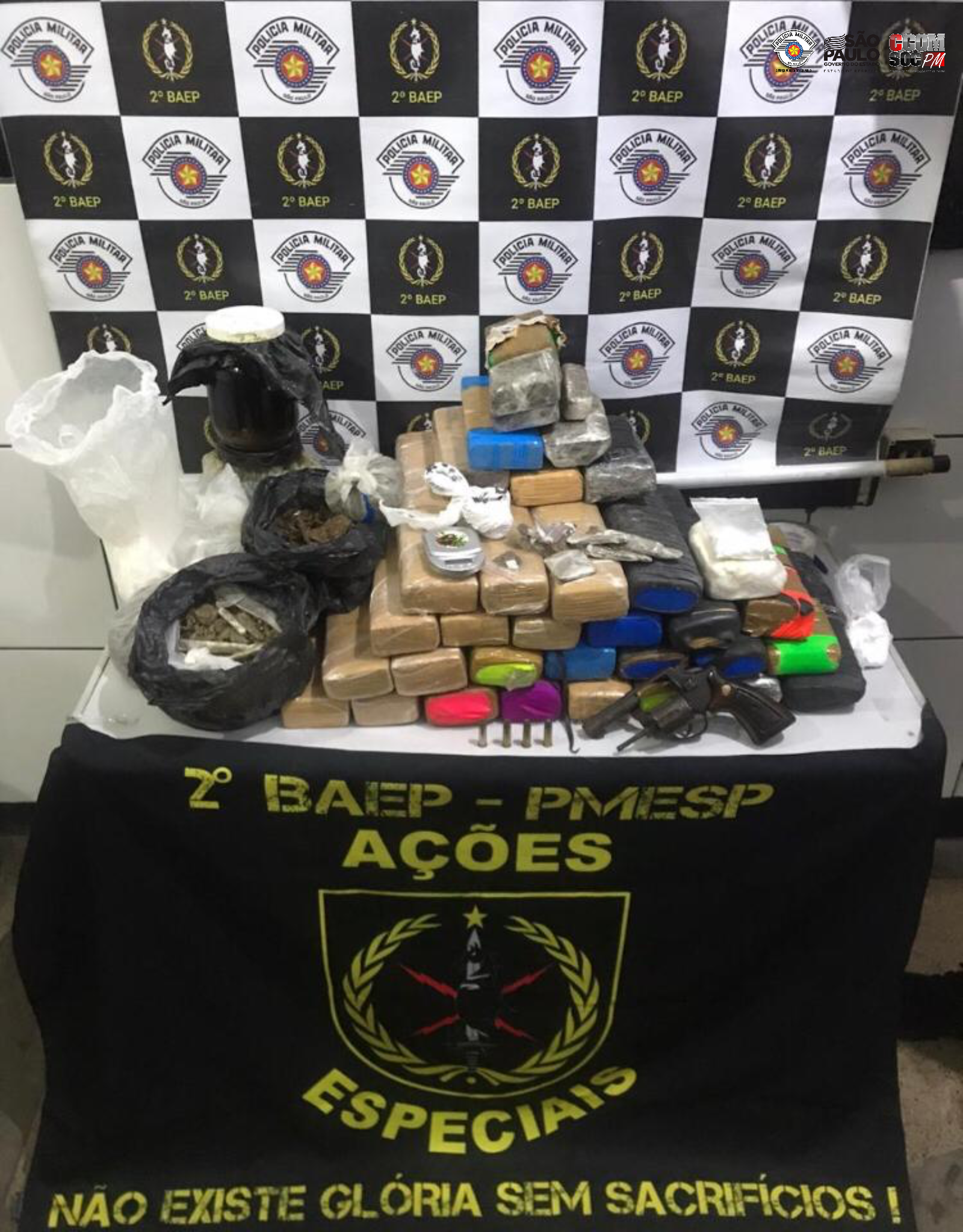 Quinta-feira (24), uma equipe do 2º Batalhão de Ações Especiais de Polícia estava em patrulhamento pelo Bairro Santa Rosa, Guarujá, quando abordou um indivíduo em um veículo. Durante busca pessoal foi localizado com ele um revólver calibre 38 e munições. Indagado, o abordado informou ser gerente do ponto de tráfico do referido bairro, bem como revelou para a equipe o local onde guardava as drogas. Já na casa indicada, outro homem foi detido, e depois de franqueada a entrada da equipe foi possível localizar em um quarto a quantidade de 34 tijolos e 06 sacolas à granel de maconha, totalizando 37,035 kg, 02 potes contendo haxixe, totalizando 3,130 kg e 07 sacos contendo cocaína, totalizando 1,495 kg. Os criminosos foram conduzidos DP Sede de Guarujá, onde permaneceram à disposição da Justiça.