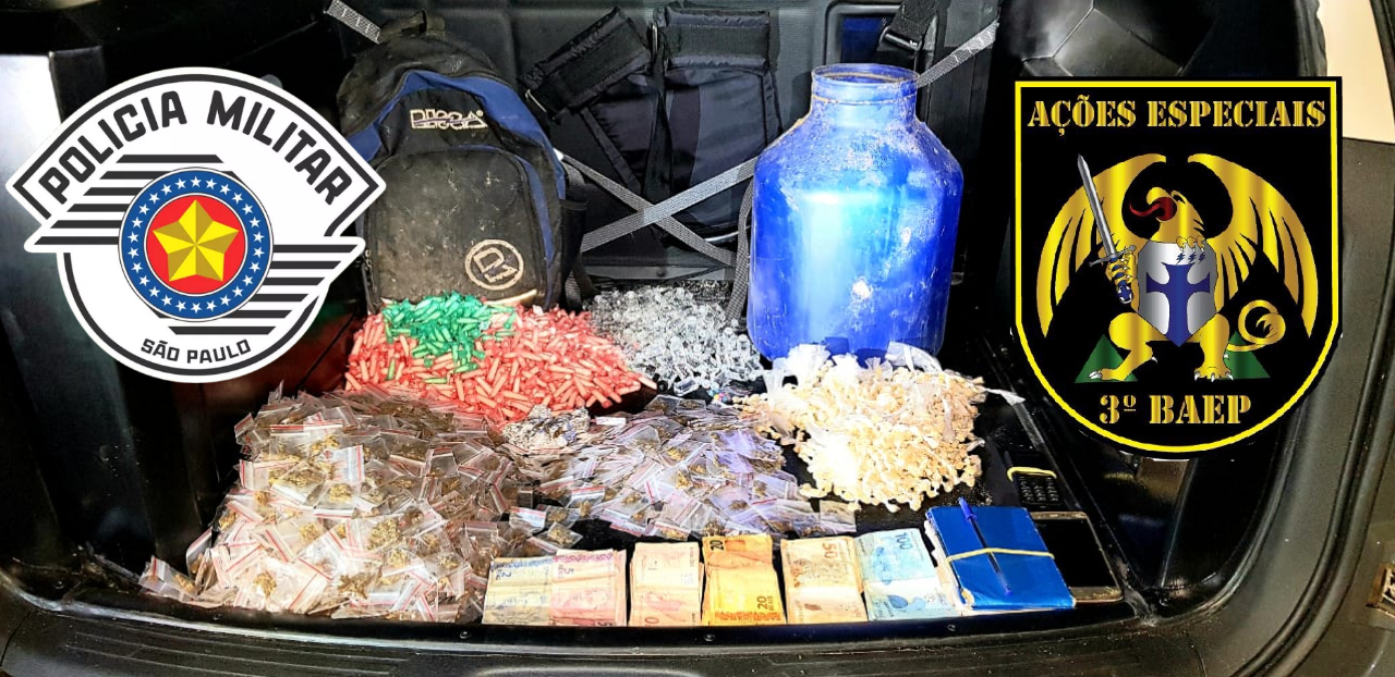 Segunda-feira (25), policiais do 3º BAEP – Batalhão de Ações Especiais de Polícia prenderam um criminoso e apreenderam grande quantidade de drogas, em uma casa no bairro Vila Machado. Durante patrulhamento a equipe desconfiou e abordou um indivíduo com uma mochila, que ao perceber a viatura começou a correr por uma área de mata, margeando o Rio Paraíba, e posteriormente tentando entrar em uma residência, onde foi detido. Na mochila foram localizados, 13 comprimidos de LSD, 299 porções de skunk, 304 porções de maconha, 522 pedras de crack, 268 pinos de cocaína, 23 frascos de lança-perfume, R$ 4.781,00, 02 celulares e 02 cadernos com anotações sobre o tráfico de drogas. Já na casa foram localizados 1.000 pinos com cocaína, 100 frascos de lança-perfume, 327 porções de maconha e 699 pedras de crack. A ocorrência encaminhada ao Plantão Policial, onde o criminoso permaneceu à disposição da Justiça.