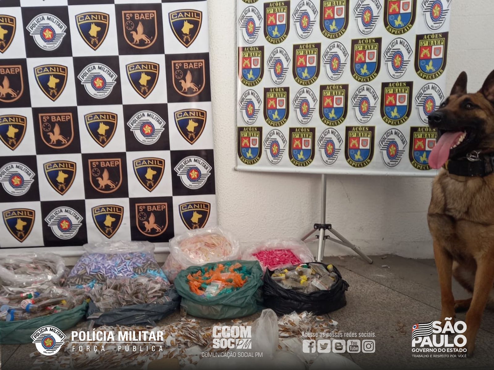 A Polícia Militar deteve dois criminosos e apreendeu cerca de 24,6 mil porções de maconha, crack e cocaína, durante uma operação deflagrada na tarde desta quinta-feira (2), em Carapicuíba, na região metropolitana de São Paulo. Policiais militares do 5º BAEP – Batalhão de Ações Especiais de Polícia realizavam ação para combater o tráfico de drogas na Vila Veloso quando indivíduos fugiram ao perceber a presença da equipe. Dois dos criminosos carregavam sacolas, que foram dispensadas por eles durante a fuga e depois recuperadas pelos militares. Ambos foram acompanhados pelos agentes e detidos na rua Gomes. Em vistoria nas sacolas que eram transportadas pelos homens, foi encontrada grande quantidade de drogas, além de R$ 63 e dois celulares. Em continuidade à operação, os policiais militares tiveram apoio do canil, por meio do cão farejador Ozzy, que após buscas nas imediações onde a dupla foi presa encontrou mais entorpecentes. Ao todo, foram apreendidos para perícia 15.592 porções de cocaína, 1.694 de maconha e 7.328 de crack. Os outros objetos e dinheiro também foram recolhidos. Os dois criminosos foram levados ao 2º Distrito Policial da cidade, onde foram indiciados por tráfico e associação para o tráfico de drogas e depois encaminhados ao cárcere para permanecer à disposição da Justiça.