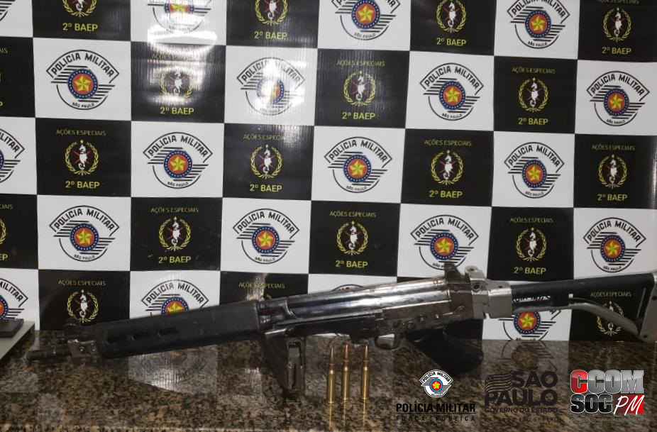 Após denúncia, de que um indivíduo mantinha em sua residência a posse de um fuzil, pela estrada do Paraitinga, a equipe do 2° BAEP, se deslocou até o local para averiguação. No local os policiais realizaram uma incursão, localizando o indivíduo em frente a residência e realizaram abordagem. Na abordagem, o suspeito acabou confessando aos policiais que que guardava um Fuzil Belga calibre 7.62, além de um carregador com 03 munições intactas, um celular e um computador. O criminoso tinha passagem criminal por estelionato e informou também que tinha ligação com uma facção criminosa. A arma apreendida, tem raio de letalidade de extremo alcance.