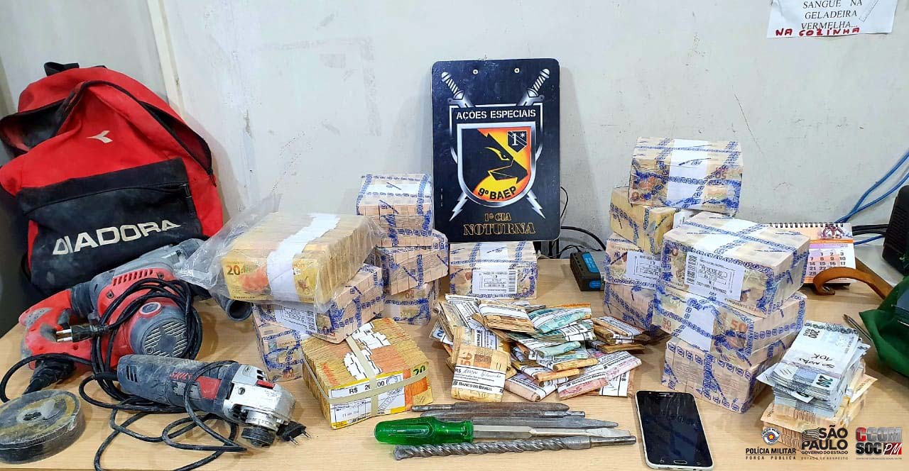 Imediatamente a equipe chegou ao local, realizou o cerco e conseguiu deter dois indivíduos com malotes de R$ 765.160,00, além dos equipamentos utilizados para arrombar o cofre.