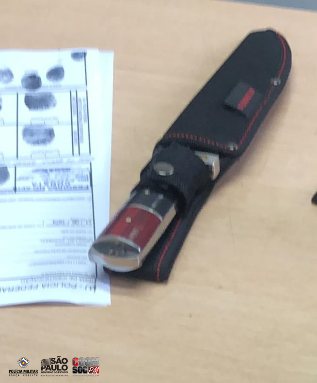 Após verbalizações, com técnica e profissionalismo dos PMs, o infrator se rendeu e soltou a faca. Ele foi detido e encaminhado ao 12° Distrito Policial. A faca foi apreendida.