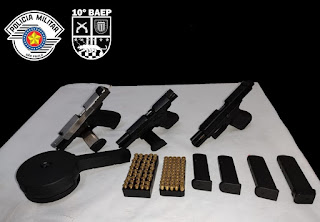 O segundo detido em entrevista com as equipes, confirmou que em sua residência havia uma arma de fogo para sua defesa. Foi realizada diligências até o local indicado, onde foram localizadas mais 3 pistolas, sendo duas delas no calibre 9mm e uma no calibre .40, todas ilícitas, 100 munições 9mm e 8 carregadores de pistola, sendo um deles modelo Drum (carregador que altera a capacidade de disparo da arma).