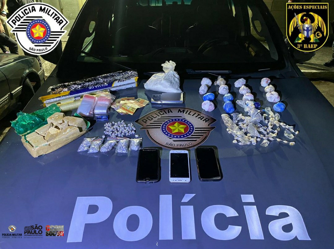 Na tarde de ontem (13), os policiais militares do 3° Batalhão de Ações Especiais de Polícia, após receber uma denúncia anônima sobre tráfico de drogas, abordou 3 (três) indivíduos, todos com antecedentes criminais, pelo Bairro Jardim Minas Gerais no município de São José dos Campos. Indagados a respeito do imóvel em que estavam, alegaram ser um local abandonado e que utilizavam para o armazenamento e embalo de drogas. No interior da residência foi localizado 01 tijolo bruto de crack, 810 pedras de crack embaladas em saco plástico, 209 pedras de crack embaladas em papel alumínio, 01 sacola plástica contendo cocaína à granel, 03 celulares, apetrechos diversos para o embalo de drogas, 01 caderno de anotações do tráfico e R$115,00 em espécie. Diante dos fatos, criminosos e drogas foram encaminhadas ao Distrito Policial Sul de São José dos Campos.