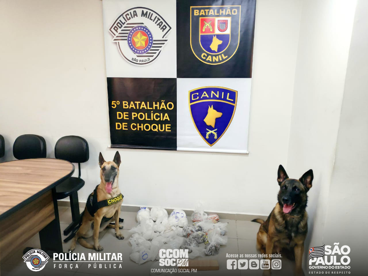 Sexta-feira (04), Policiais Militares do 5º Batalhão de Polícia de Choque – CANIL, durante Operação na Comunidade de Paraisópolis, realizaram varredura de detecção de drogas com os cães farejadores Dóris e Machi, que indicaram drogas em um VW Voyage. No interior do veículo foi localizado um compartimento cofre com 01 tijolo e 500 porções de maconha, 57 porções de crack, 3.327 papelotes de cocaína e 01 saco a granel.