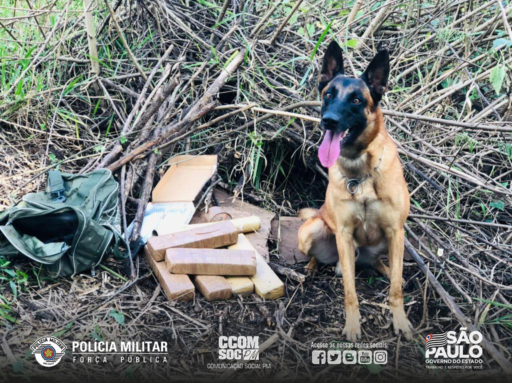 No local e ao perceberem a presença dos policiais militares, os indivíduos fugiram para a mata não sendo possível abordá-los.  Com o apoio do Cão Yran, localizaram uma bolsa verde contendo 6 tijolos de maconha, totalizando 4,716 kg da droga, 1 faca, uma balança digital e um rolo de plástico filme.