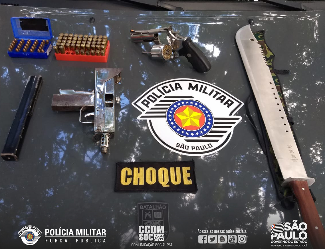 Quarta-feira (23), Policiais Militares do 2º Batalhão de Polícia de Choque receberam uma informação de um indivíduo com uma arma de fogo no bairro Jardim Leônidas Moreira e se deslocaram até o local para averiguação. Ao realizar a abordagem, o indivíduo confessou a posse e disse que estava em sua casa. Após diligências em sua residência, foram localizadas duas armas de fogo, uma calibre .44mm com 48 munições intactas e 03 cartuchos deflagrados e uma UZI 9MM (fabricação artesanal) contendo 28 munições, além de uma espada e 03 munições de armamento calibre .45mm.