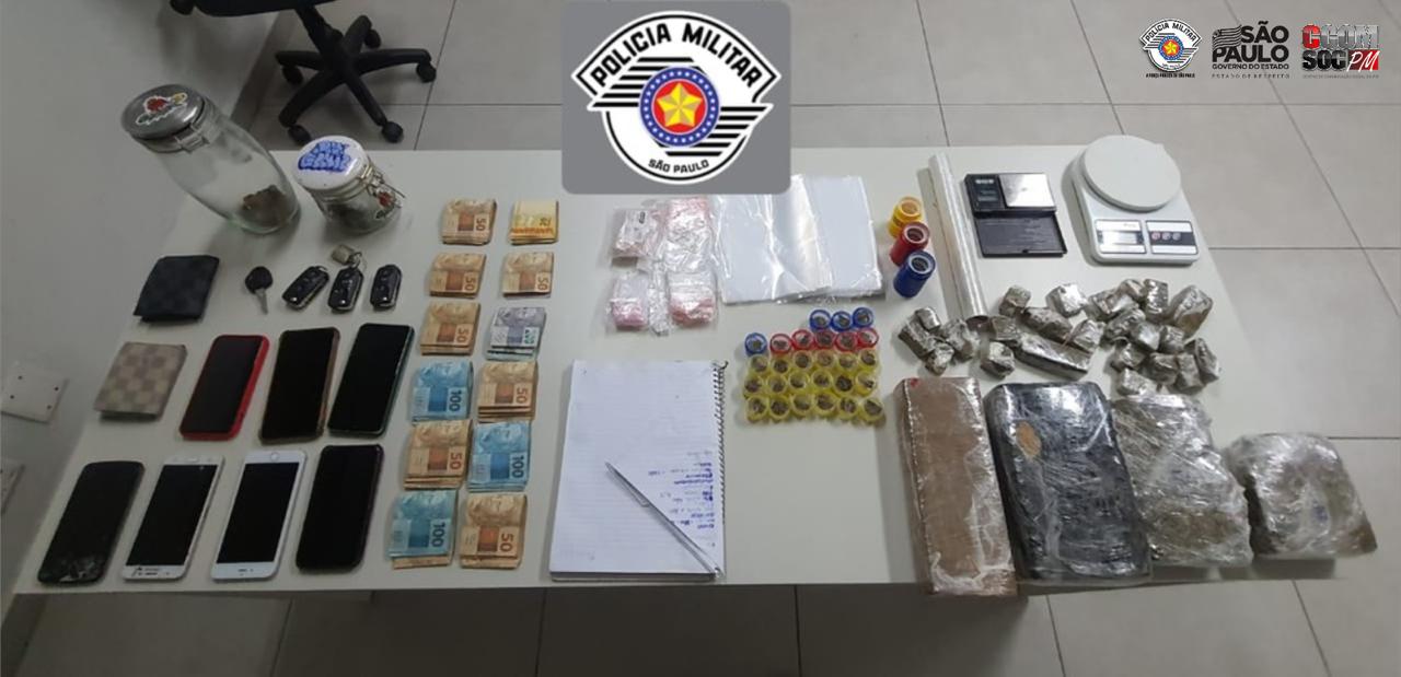 Sexta-feira (13), policiais militares do 49º Batalhão de Polícia Militar do Interior prenderam cinco criminosos por tráfico de drogas, no bairro Vila Nova Jundiainópolis, em Jundiaí. A equipe recebeu uma denúncia de que o grupo utilizava um apartamento para embalar a droga. Ao chegar no local, quatro dos detidos foram abordados dentro de um carro. No porta-malas do veículo foram encontradas 516 gramas de skank. Um deles disse ser o dono da droga e confessou que guardava mais entorpecentes em casa. No endereço indicado, os policiais encontraram uma mulher, que permitiu a entrada da equipe e também entregou uma mochila com três tijolos de skank. Também foram encontradas mais porções da droga, embalagens, balanças, cadernos de contabilidade e mais R$ 6,7 mil, além de outros dois veículos, informou a PM. No total, foram encontrados R$ 9.064 e 5,43 quilos de entorpecentes. A mulher e os outros quatro suspeitos foram presos e encaminhados para a Delegacia de Polícia de Jundiaí , onde permaneceram à disposição da Justiça.