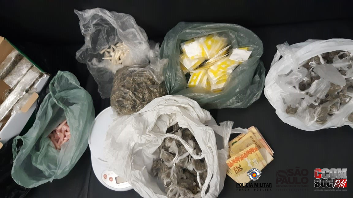 Durante operação pela comunidade dos Cafezais no município, juntamente com equipes do CANIL, os policiais prenderam um traficante e apreenderam certa quantia de drogas: