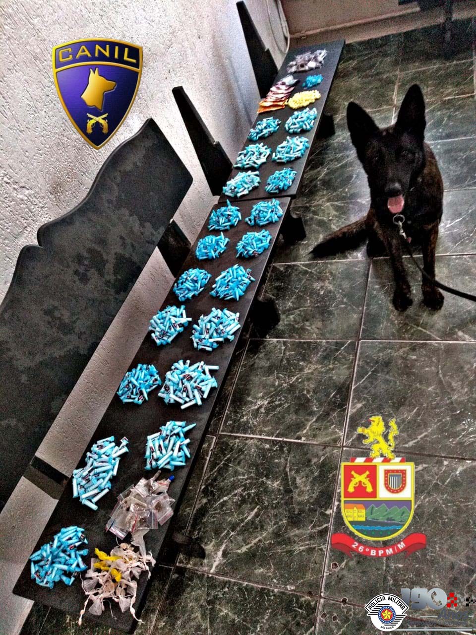 Com o apoio do cão policial Ajax, foram localizadas, escondidas em uma mata próxima, porções a serem comercializadas, de embalagens idênticas as que foram localizadas com o suspeito.