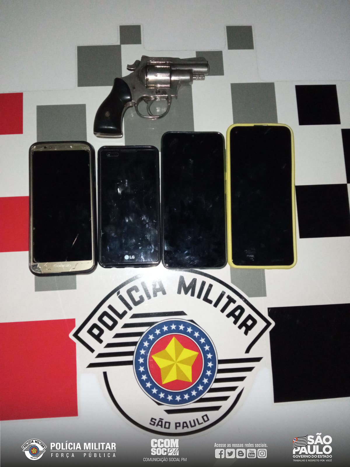 Terça-feira (03), a equipe do 36º Batalhão de Polícia Militar Metropolitano foi informada de um roubo em andamento pela Rua Adamastor. No local, os Policiais Militares conseguiram abordar um indivíduo em uma moto e em busca pessoal foi localizado um revólver calibre 22 com uma munição intacta e 04 celulares em uma mochila de entrega de pizza, além da placa do veículo estar adulterado. Foi realizado contato com a vítima, que confirmou o indivíduo como autor do roubo, informando que havia outros dois que haviam se evadido em outra moto. Ocorrência encaminhada ao Distrito Policial de Embu das Artes.