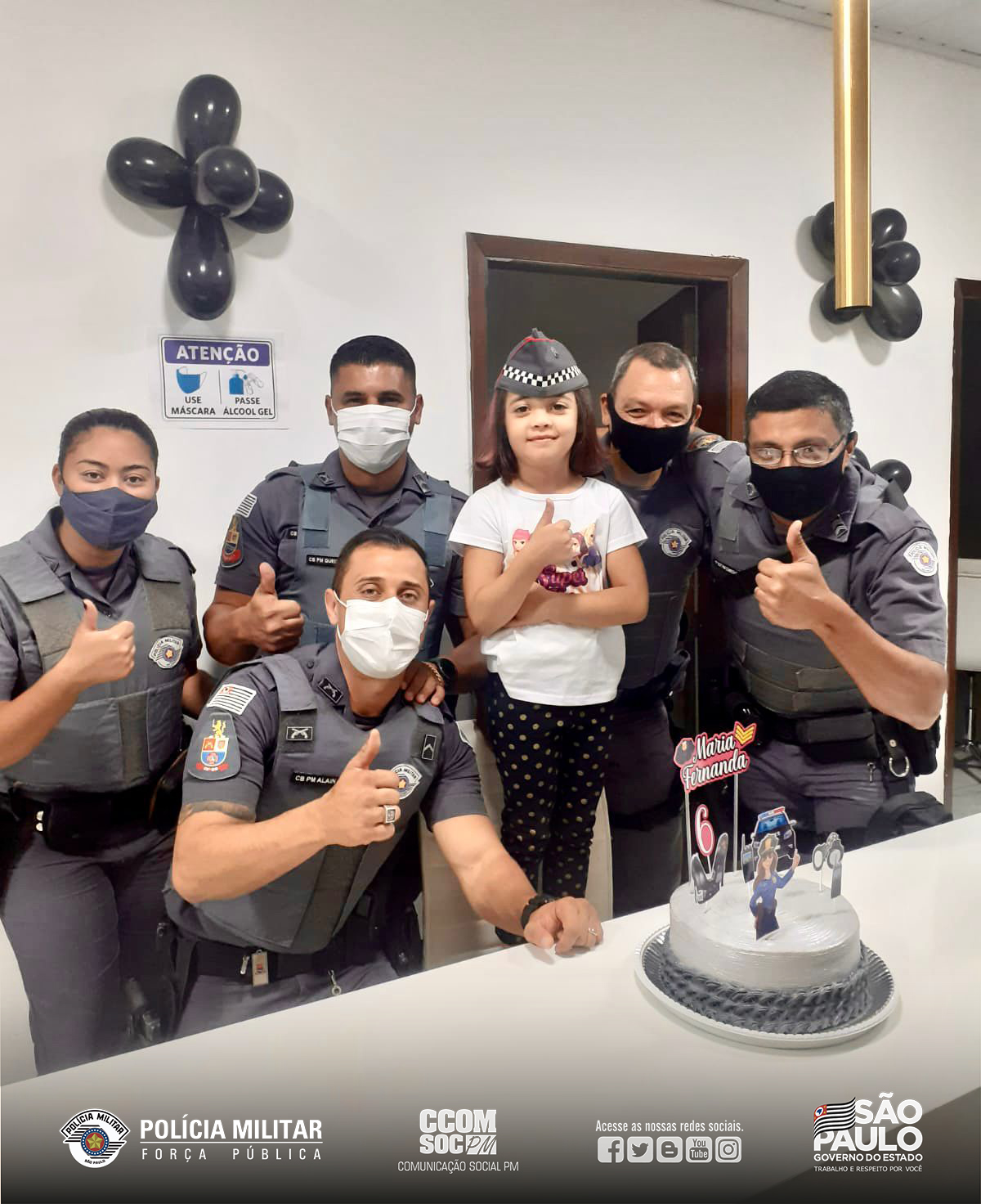 🥳🥰 A pequena Maria Fernanda completou 6 aninhos no último sábado (21). Ela mora em Andradina, interior de São Paulo, e é apaixonada pela Polícia Militar. Na data especial, fez questão de comemorar ao lado dos amigos e heróis policiais. 🥰💕🥳
