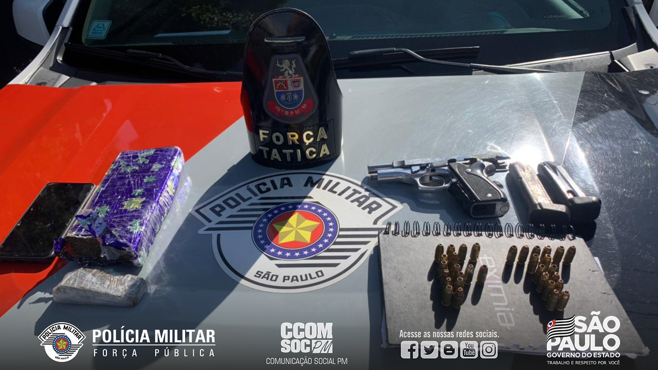 Quinta-feira (15), policiais militares da Força Tática do 15º Batalhão de Polícia Militar Metropolitano durante patrulhamento pela Comunidade São Rafael, abordaram um indivíduo que apresentou um documento falso e logo em seguida, confessou que estava procurado pela Justiça. Na busca pessoal encontraram uma pistola Taurus 380, um carregador sobressalente, totalizando de 32 munições e uma sacola com um tijolo de maconha.