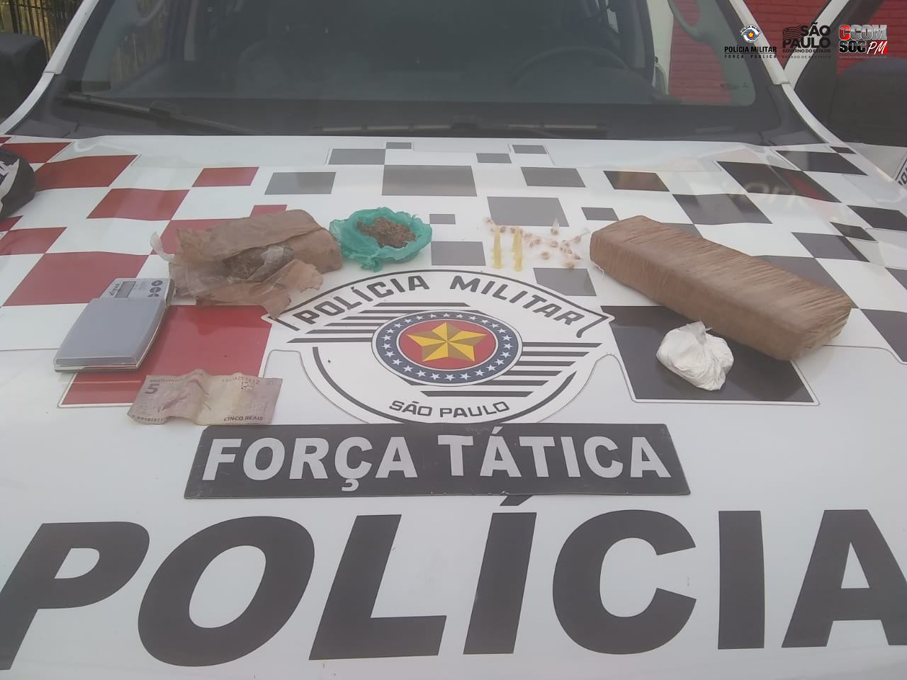 Na sacola continha dois tijolos de maconha, uma porção a granel de cocaína e uma balança de precisão. Na busca pessoal foram localizados mais pinos de cocaína, pedras de crack, porção de maconha e a quantia de R$ 5,00.