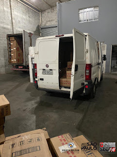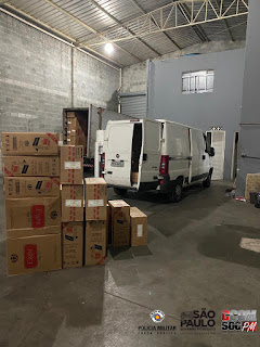 Durante patrulhamento pela rua Vitória, Santana de Parnaíba, a equipe de Força Tática avistou um casal em atitude suspeita no interior de um veículo, Honda/ Fit, na cor cinza em frente a um galpão. O casal ao notar a presença da equipe tentou se evadir, porém foram abordados nas proximidades do local após um breve acompanhamento. Na abordagem o indivíduo acabou confessando aos policiais que era proprietário de 3 caminhões e responsável pelo galpão e transporte de mercadorias contrabandeadas. Posterior, em averiguação ao galpão, a equipe localizou 03 caminhões e 1 Van carregados com cigarros contrabandeados do Paraguai.
