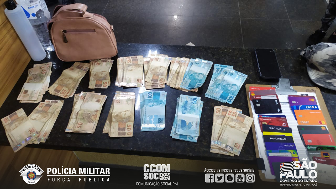 Terça-feira (08), policiais militares da Força Tática do 15º Batalhão de Polícia Militar Metropolitano, durante patrulhamento pela Avenida Monteiro Lobato, foram informados por transeuntes e logo após pelo COPOM – Centro de Operações da Polícia Militar que nos caixas eletrônicos de um hipermercado, haviam três pessoas efetuando saques a mais de 3h, aparentando se tratar de valores altos e com diversos cartões bancários. No local, na busca pessoal foi localizado dentro de uma bolsa R$ 12.277,00 em espécie e 24 cartões de diversas instituições bancárias.