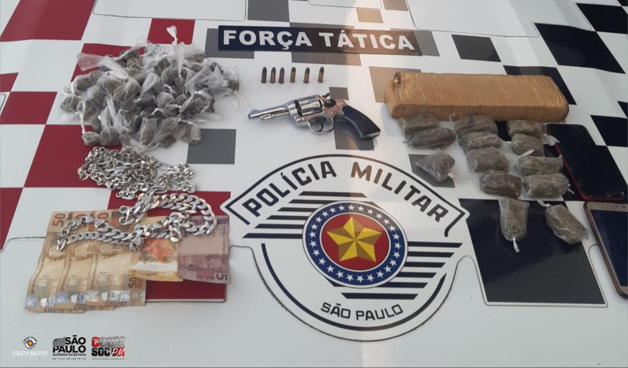 Segunda-feira (31), policiais militares da Força Tática do 23º Batalhão de Polícia Militar do Interior realizavam o patrulhamento pela Rodovia Hamilton Vieira Mendes, bairro Itagaçaba, onde abordaram o condutor do veículo VW/ Saveiro, e na vistoria veicular localizaram revólver calibre 32, 6 munições intactas, R$ 175,00, 1 tijolo e diversas porções de maconha. O criminoso foi levado ao Plantão Policial de Cruzeiro, onde permaneceu à disposição da Justiça.