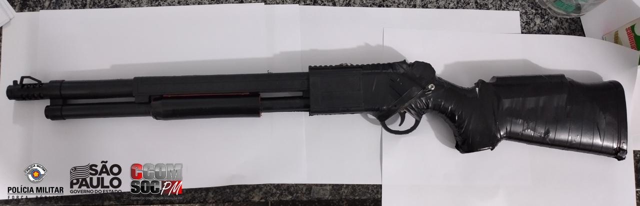 De posse das informações, equipe do 4º BAEP, após patrulhamento com vistas pela Av Marechal Tito n°6300, deparou com o referido veículo ocupado por três indivíduos, os quais foram abordados e identificados. Na busca pessoal a equipe encontrou a quantia de R$ 50,00 reais no bolso da blusa de um dos suspeitos, já na busca veícular, foi localizado um simulacro de espingarda calibre 12.