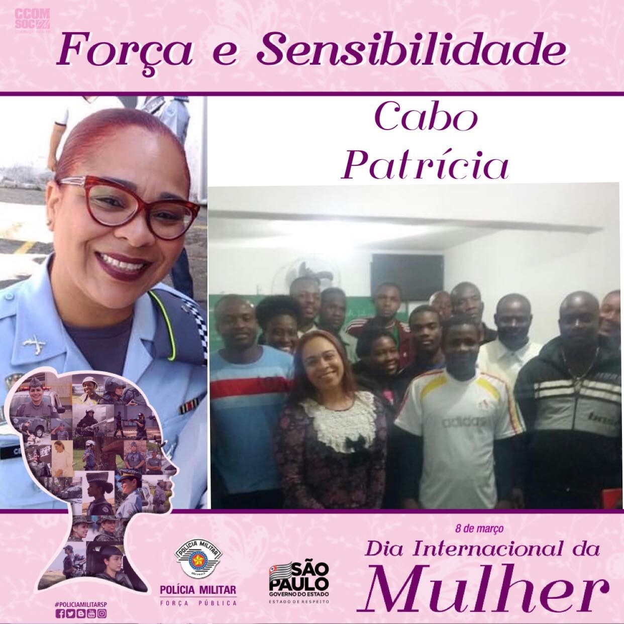A Cabo Patrícia está há 26 anos na Polícia Militar, em grande parte desse tempo atuando no policiamento na área do 48º Batalhão de Polícia Militar Metropolitano, que abrange parte da Zona Leste da capital. A policial militar já atuou em ocorrências de alto grau de complexidade e nunca mediu esforços para fazer valer o lema da Polícia Militar: preservar vidas e aplicar a lei. A Cabo Patrícia, em suas folgas durante anos, participou do PROJETO SEM FRONTEIRAS, na sede da 2ª Companhia, no bairro Guaianazes. O projeto de acolhida de haitianos, por intermédio da Cabo Patrícia, permitiu que muitos desses estrangeiros em situação de vulnerabilidade conhecessem um pouco mais sobre nossa história e exercessem na prática os direitos humanos que balizam a atuação de cada integrante da Polícia Militar. A Cabo Patrícia é uma, dentre tantas mulheres da PMESP, que fazem do propósito o seu verdadeiro diferencial na sociedade.